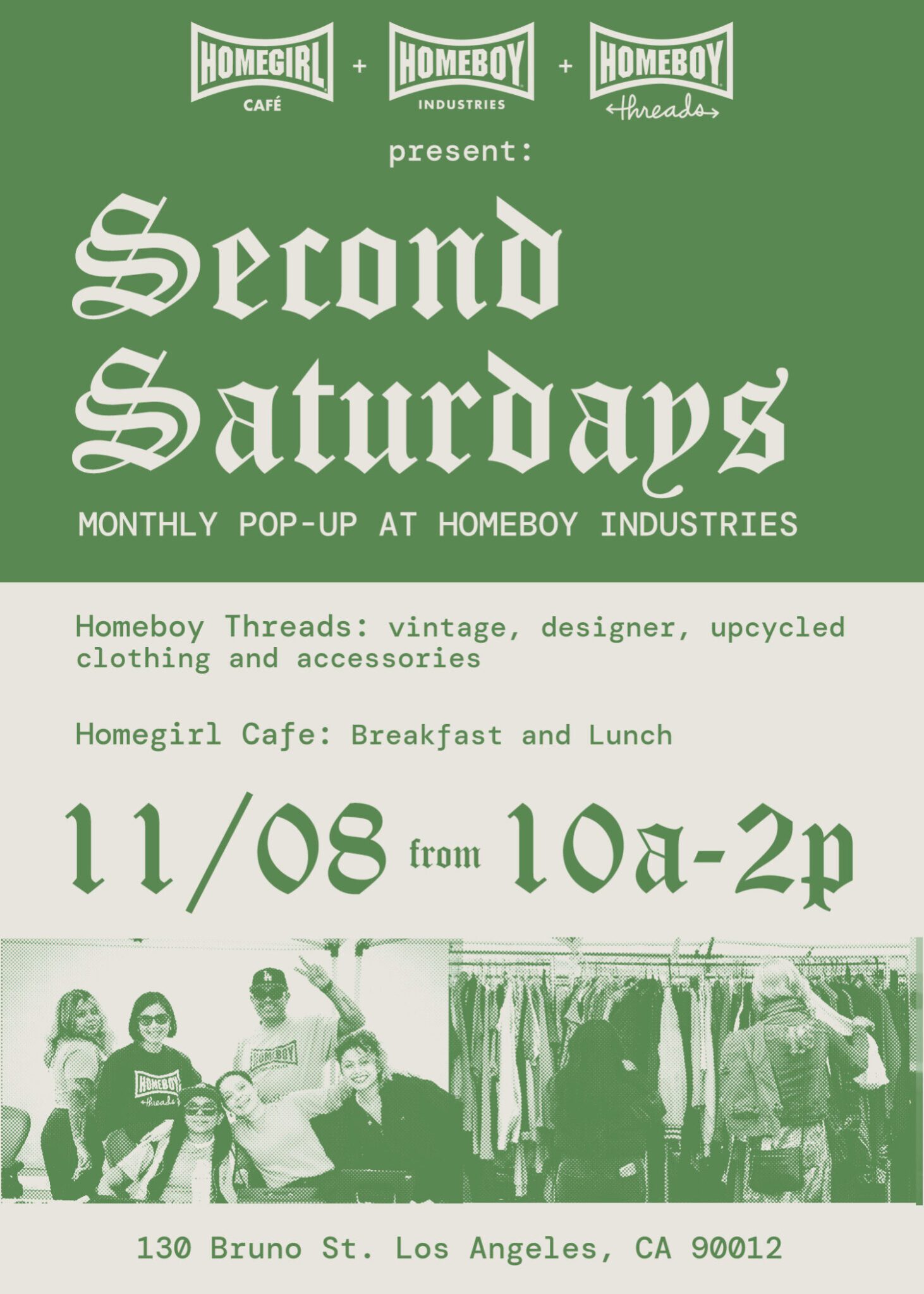 Join us every Second Saturday for a monthly pop-up at 130 Bruno St. Los Angeles, CA 90012. Stop by for breakfast or lunch at Homegirl Cafe and shop vintage, up-cycled, and new clothing and accessories with Homeboy Threads. All proceeds directly benefit Homeboy Industries mission of hope and healing.